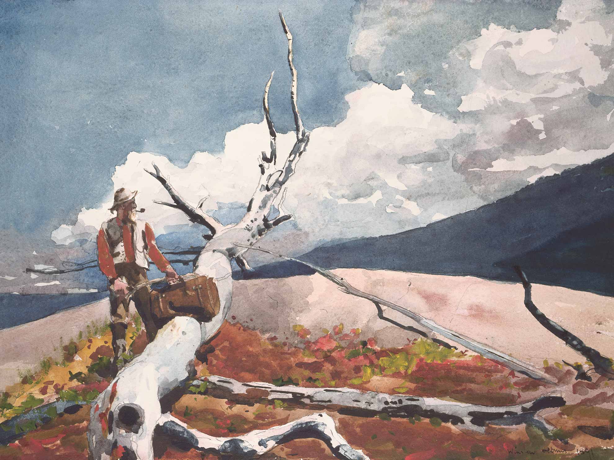 While Homer relished painting the area’s natural scenes, he was also an avid outdoorsman. He enjoyed hunting and fishing with his brother Charles, and they became founding members of the North Woods Club, a private game and fishing reserve they visited annually. Naturally, Homer began painting men fishing—as well as detailed works of fish—and stirring hunting scenes. The Adirondack Guide (1894) shows a naturalist and guide named Rufus Wallace returning from a duck-hunting trip in his canoe, while Trout Breaking (1889) highlights Homer’s fascination with the moment a fish leaps out of the water. In this watercolor, he pays close attention to the trout’s markings and coloring, and also inserts two butterflies gently floating nearby.