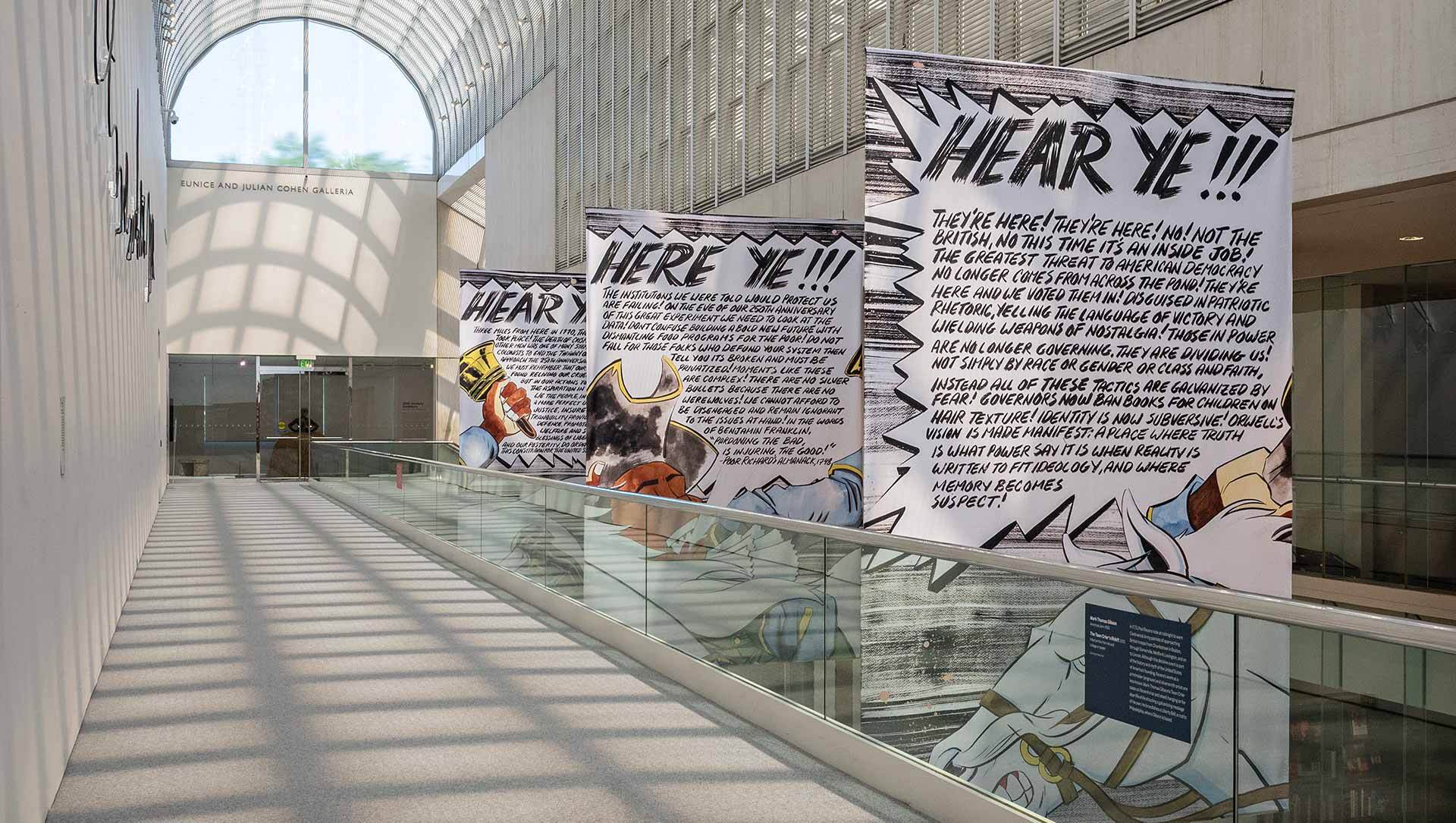 Gibson began his series in 2021 as a way to digest and archive the politics of our fast-moving times. The Crier is typically rendered in graphic lines and ink washes and decked in Revolutionary-era clothing; his words blare like news headlines, matching the pace of endless digital “doomscrolling.” Here, unfolding over three banners that resemble the panels of a comic strip, Gibson’s handmade drawings compel visitors to slow down when reading. In many ways a stand-in for Gibson—a Black man, a history buff, and a concerned citizen—the Crier takes on the role of Paul Revere astride his horse, hanging on for dear life and while shouting a galvanizing message. The banners also feature Gibson’s take on the American flag—a striking reenvisioning that explores its symbolism, promise, and reality and implores reflection on American history.